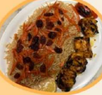 Can’t decide whether to have chicken or beef have them both serving with with delicious Afghan traditional Qhabuli rice topped shredded carrots and raisins.